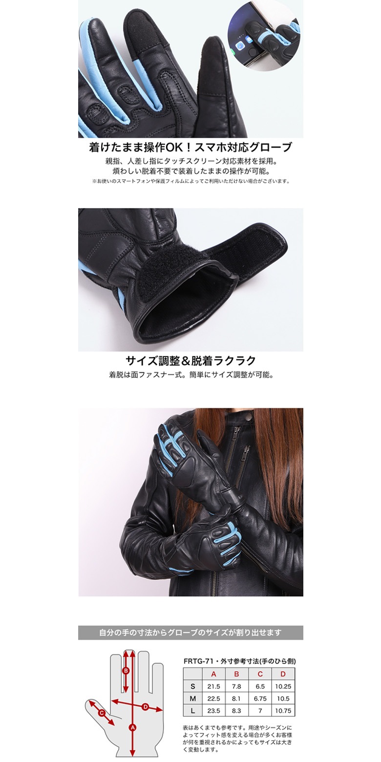 DEGNER(デグナー)レディースレザーグローブ FRTG-71 バイク用品 グローブ 女性用 牛革 ソフトパッド付 オールシーズン 取寄品