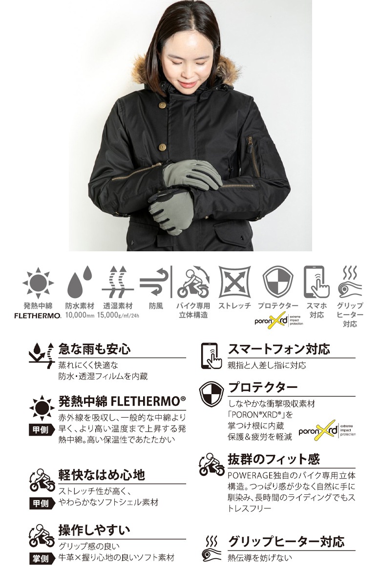 やわらかく軽いはめ心地が自慢の防寒グローブ。防水透湿フィルム内蔵で突然の雨でも安心です。掌側はグリップ感の良い牛革と、ソフトで握り心地の良い素材の組み合わせ。甲側はストレッチ性が高いソフト素材。中綿には、一般的な素材より短時間に高温度まで上昇する発熱中綿フレサーモ?を採用することで、軽いはめ心地で疲れにくくあたたかいグローブが実現しました。POWERAGE独自のバイク専用立体構造で、カジュアルな見た目からは想像できない抜群のフィット感。掌つけ根に衝撃吸収素材「PORON?XRD?」を内蔵。グリップヒーター、スマートフォン操作にも対応しています。