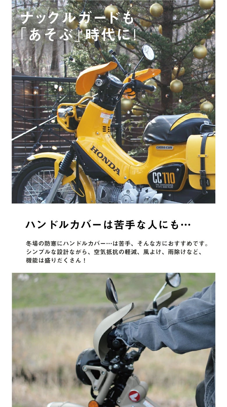 ・グリップヒーター装着車の場合、アクセル操作時にヒーターのコードがナックルガードと接触して、アクセルのもどりが多少悪くなる場合があります。ご注意ください。