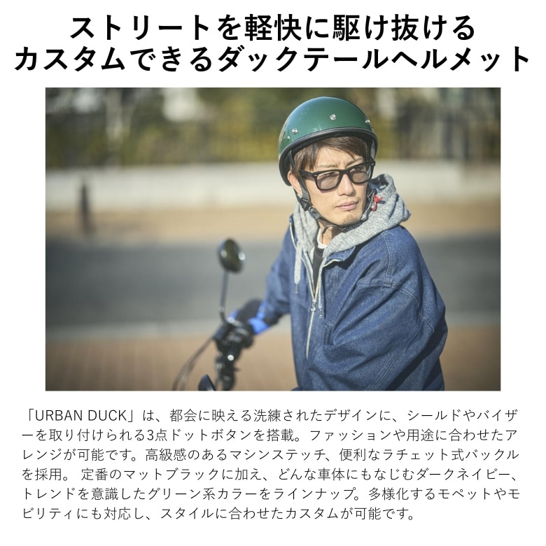 「URBAN DUCK」は、都会に映える洗練されたデザインに、シールドやバイザーを取り付けられる3点ドットボタンを搭載。