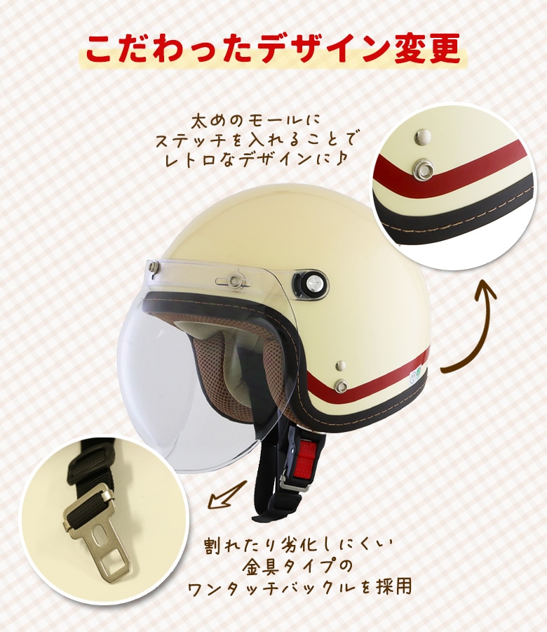 トップ > バイクパーツ > ヘルメット > ジェットヘルメット > 【送料無料】LEAD MOTORCYCLE GEAR(リード工業)スモールロージェットヘルメット NOVIA レディースバイクヘルメット バイコ限定カラー ジェットヘルメット シールド付き 全排気量対応 アイボリー/レトロレッド