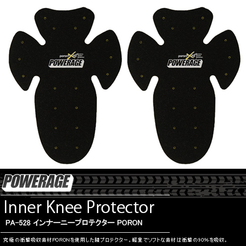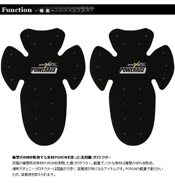 ■究極の衝撃吸収素材PORONを使用した膝プロテクター。軽量でソフトな素材は衝撃の90%を吸収。