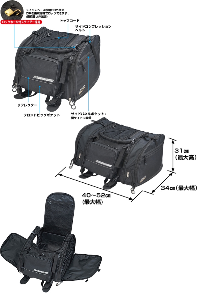 【送料無料】ROUGH&ROAD(ラフ&ロード)ラフリアバッグ53 RR9036 バイク用品 車載用バッグ シートバッグ 53L レインカバー付き 可変式 ロングツーリング ブラック 取寄品