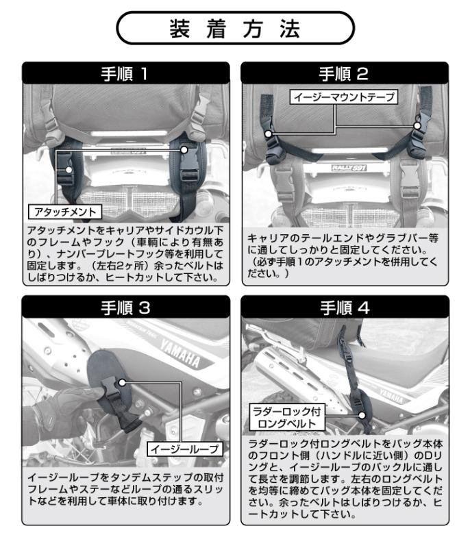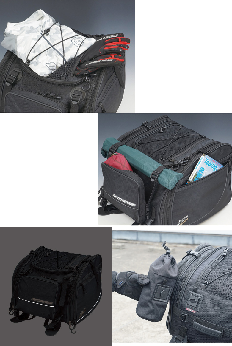 荷物へのアクセスは大きく開閉するメインのトップファスナーと両サイドからアクセス可能。バッグトップのユーティリティバンジーコードは、脱いだ衣類を挟んで固定するなど不意の荷物に便利です。レインカバー、固定用ベルト類も装備した、キャンプツーリングや長期ツーリングに使いやすいリアバッグです。