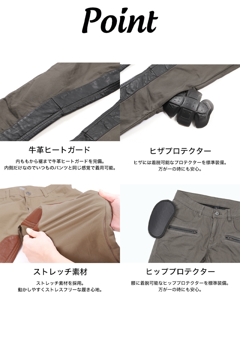 | 仕様 | ・牛革ヒートガード ・ストレッチ素材 ・膝、ヒッププロテクター付き(取り外し可能) |