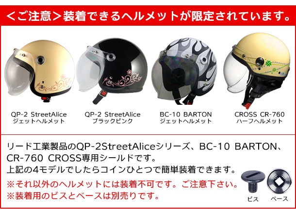 トップ > バイクパーツ > ヘルメット > 紫外線カット StreetAlice BC-10、BC-9、QP-2、QP-1、CR-760 専用補修パーツ UVカット加工バブルシールド スモーク 女性用/レディース/バイク/シールド/専用シールド/LEAD/リード工業/バブルシールド/男女兼用 取寄品