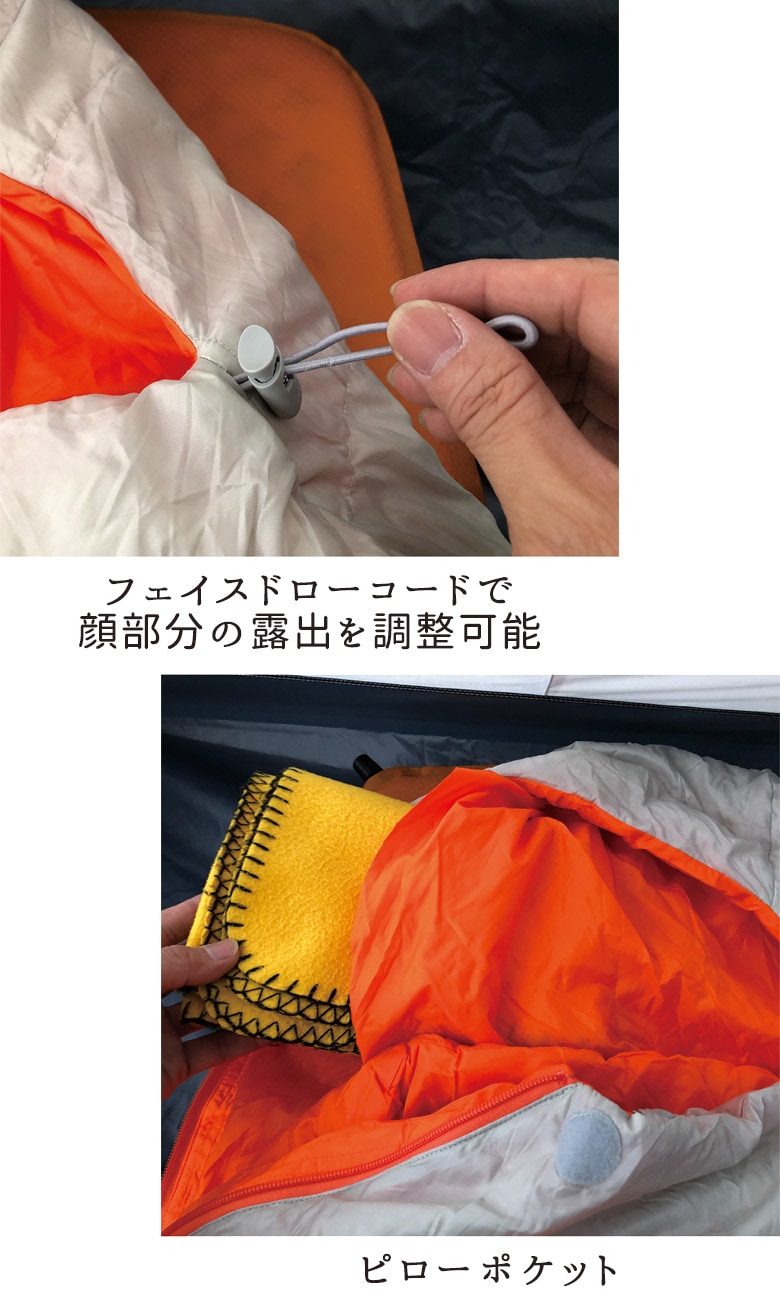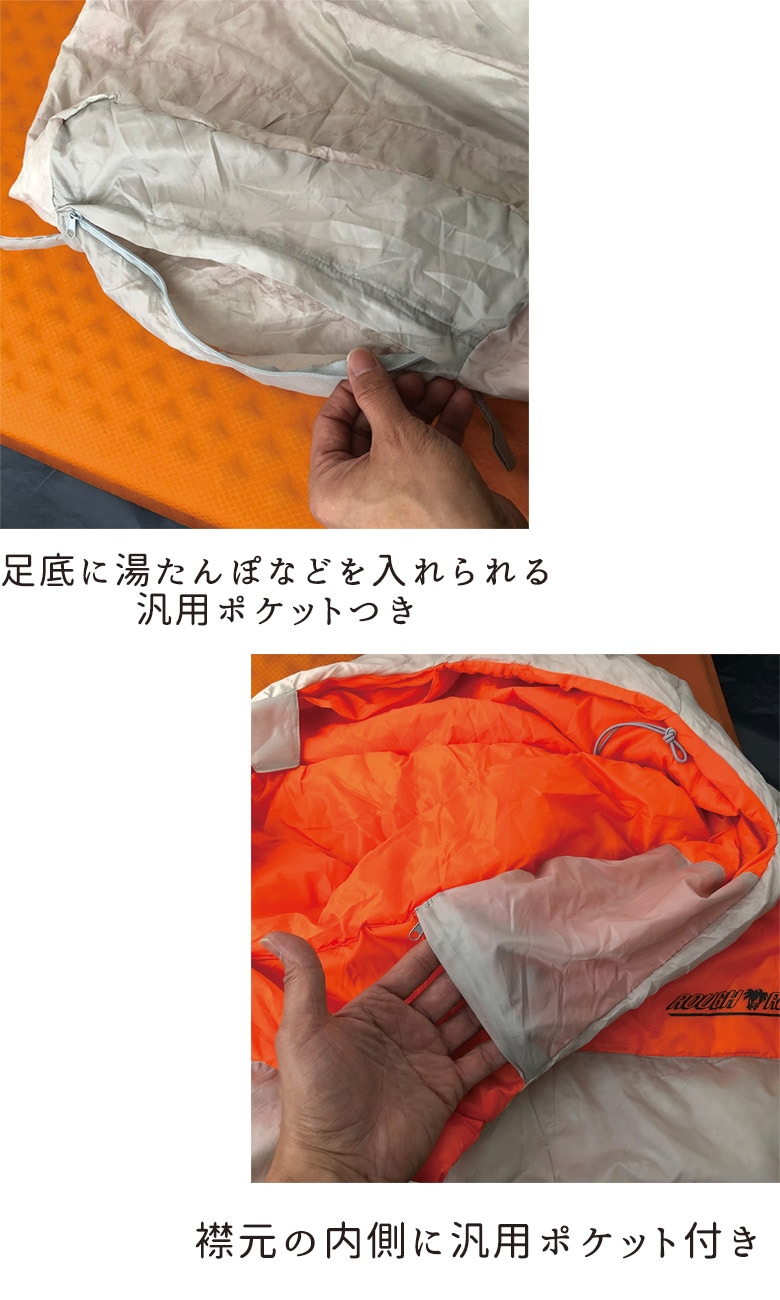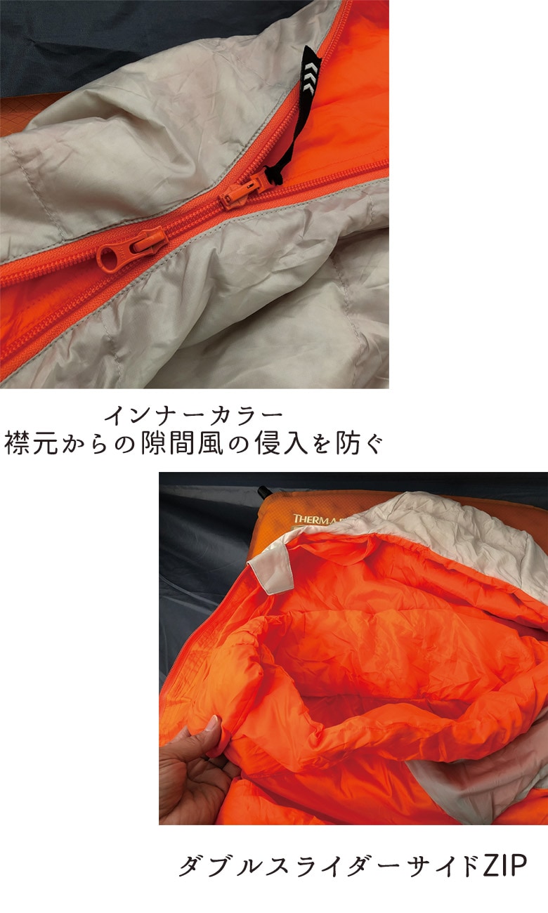 襟元の密閉性を確保するインナーカラーなどラフアンドロードらしい機能性も充実したツーリストのためのコンパクトダウンシュラフです