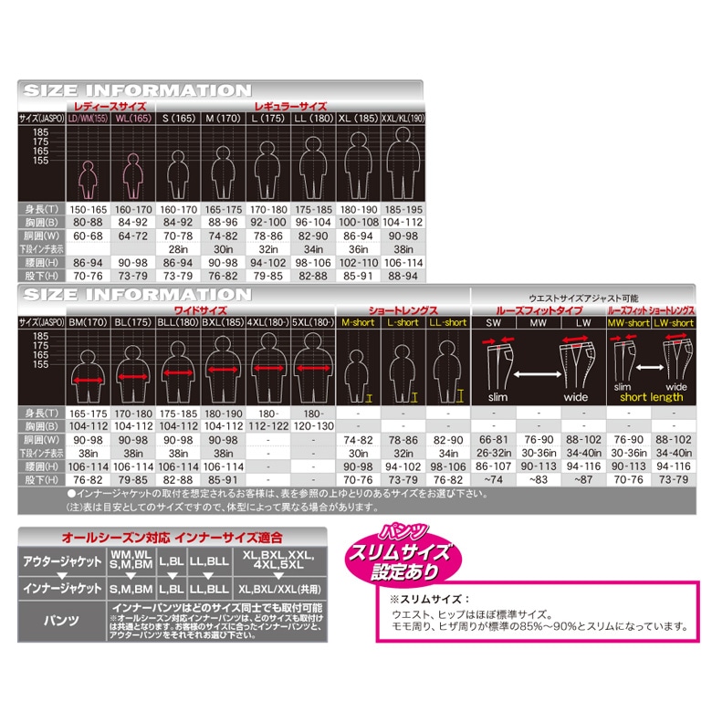 | サイズ | S、M、L、LL、XL、BM、BL |
