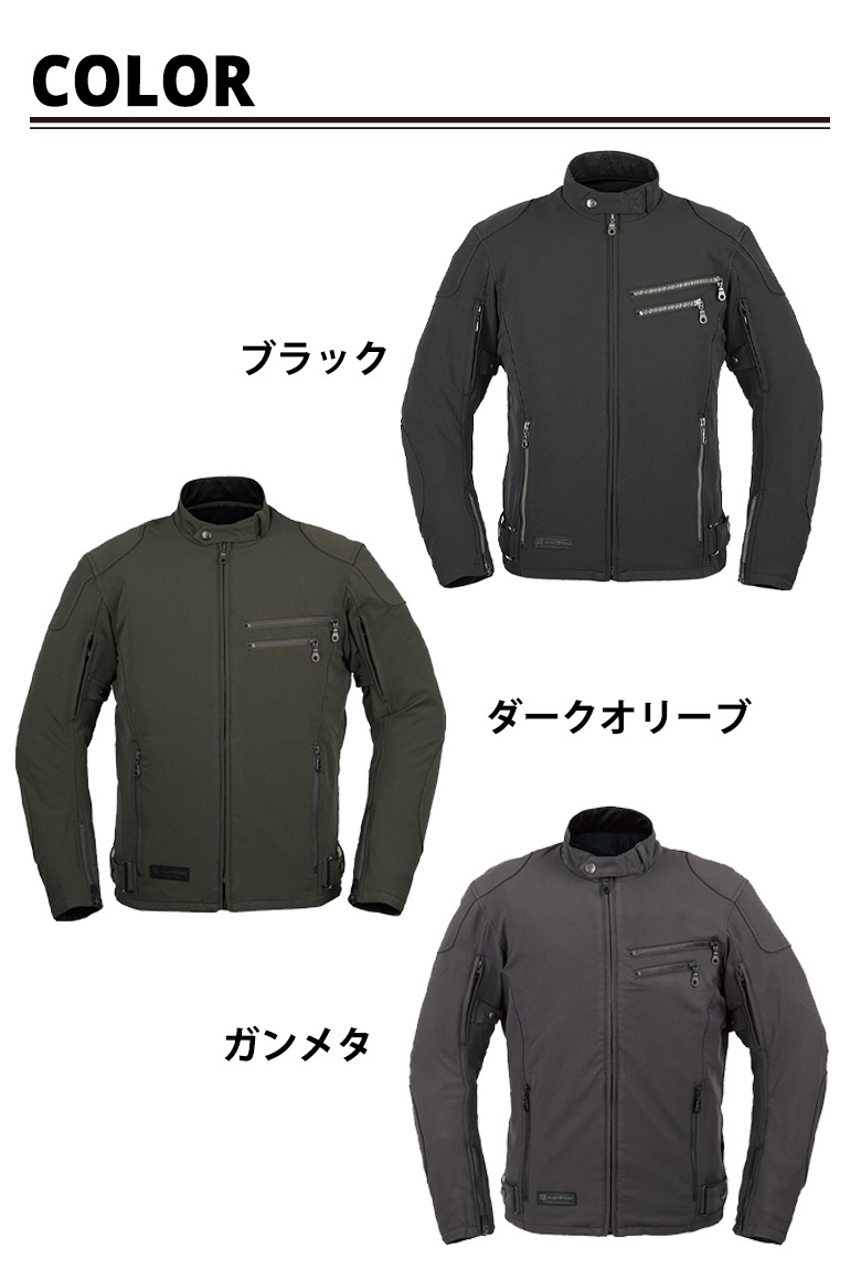 ビンテージ感たっぷりなデザインは時と場所、そしてバイクを選びません。メイン素材にエアスルーソフトシェルを採用し夏場も日差しを遮りつつ程よい通気性があり、風を通しすぎないため、春夏秋と長期間着用可能。プロテクターはエアスルータイプを採用し高い放熱性と通気性を発揮。また、袖ベンチレーション、後ベンチレーションも装備されているため、真夏のライディングも快適です。ストレッチ性のある表素材と、動きやすいライディングフォーム専用の立体裁断によりストレスを感じさせない軽快な着心地です。洗練されたスタイルがコーディネートの幅と、行動範囲をグンと広げてくれます。