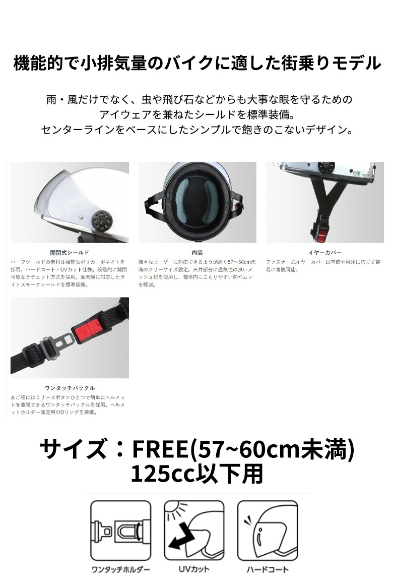 雨・風だけでなく、虫や飛び石などからも大事な眼を守るためのアイウェアを兼ねたシールドを標準装備。センターラインをベースにしたシンプルで飽きのこないデザイン。