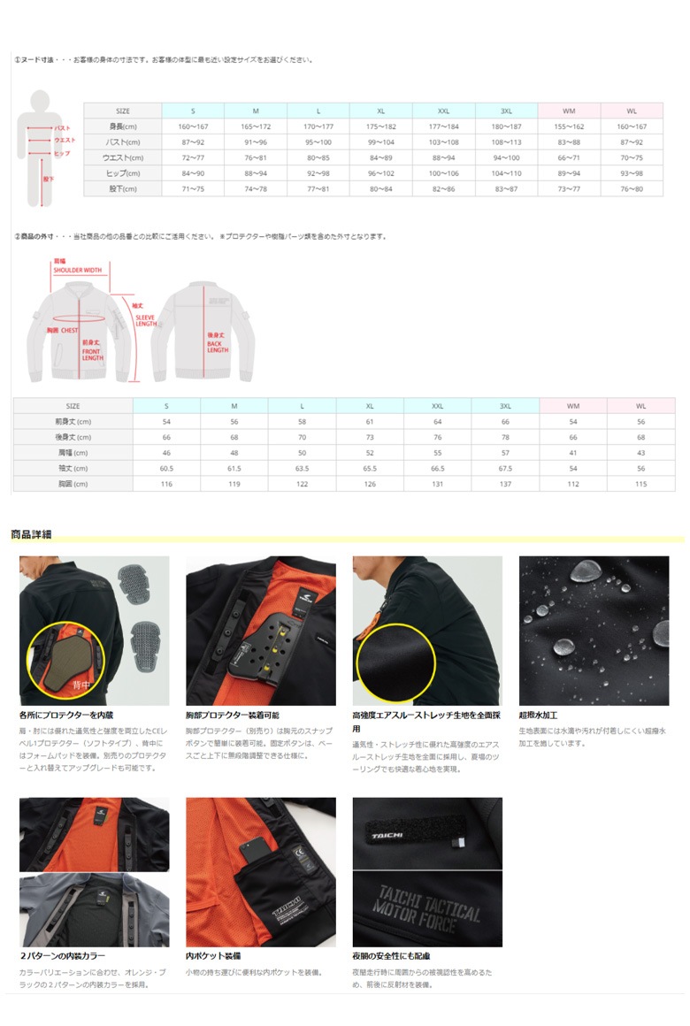 ・超撥水 ・高強度エアスルーストレッチ生地 ・CEレベル1ソフトタイププロテクター(肩・肘) |