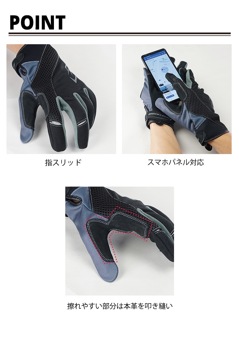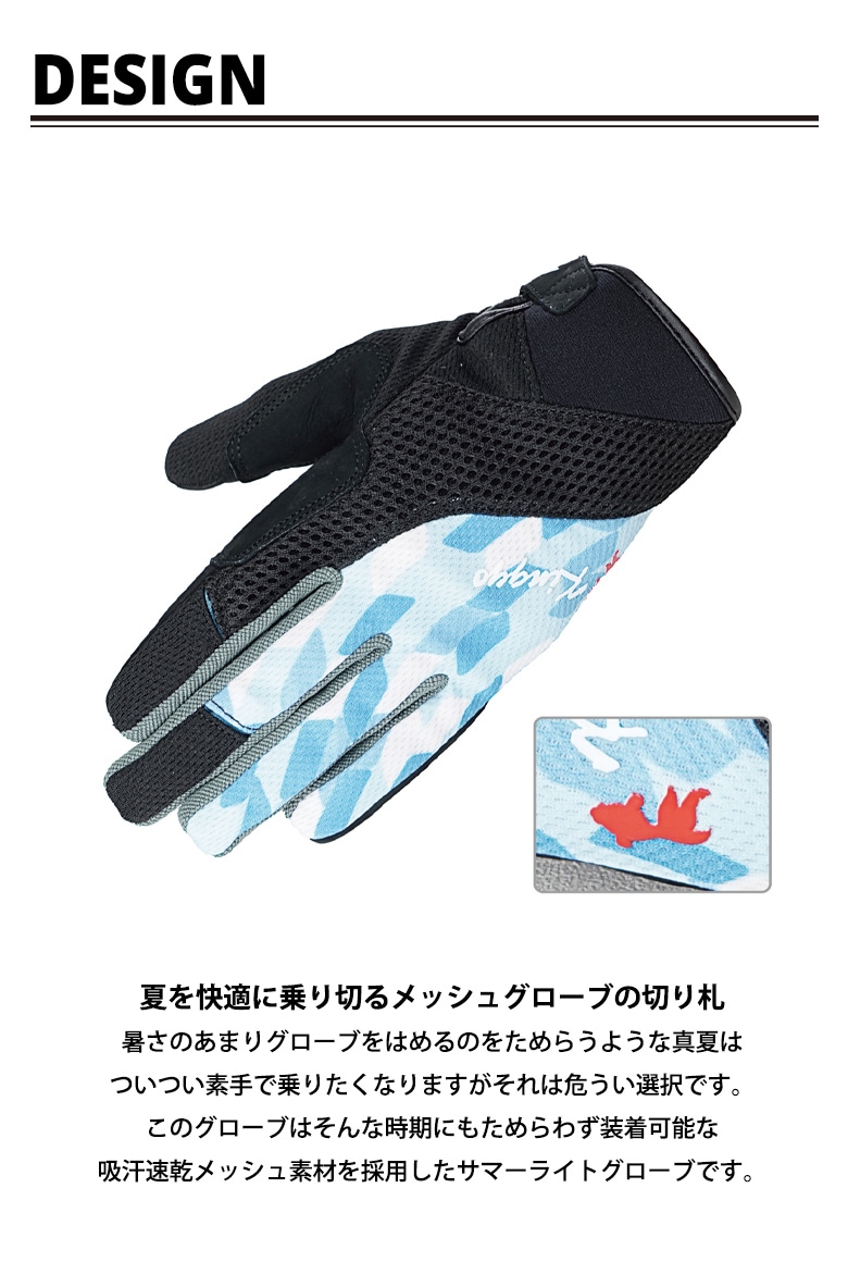 吸汗速乾メッシュ素材を採用したサマーライトグローブです。 ベンチレーション効果と優れた放熱効果、抜群のフィット感、軽い操作性で、暑くてグローブを使いたくなくなるような真夏でも、快適に使用いただけます。豊富なカラーラインナップも魅力です。