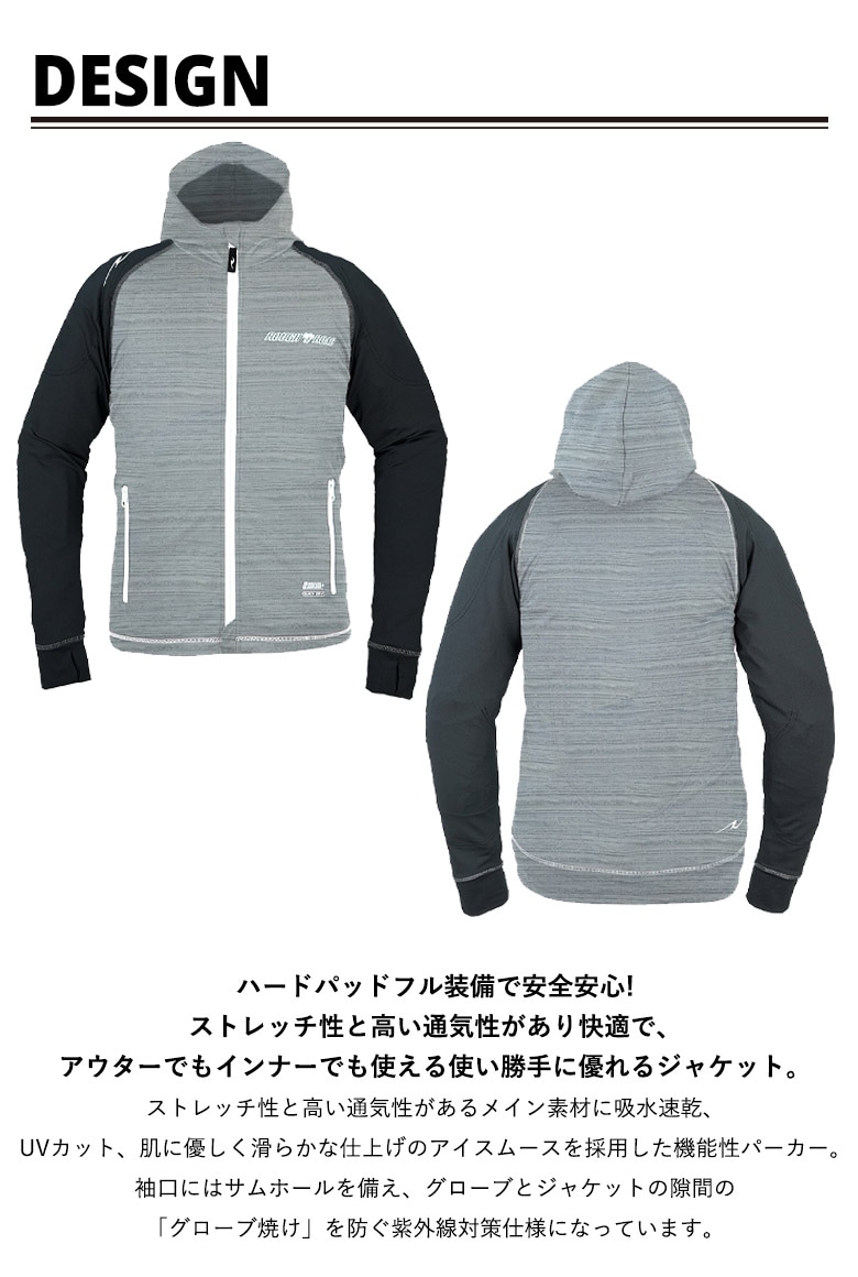 ストレッチ性と高い通気性があるメイン素材に吸水速乾、UVカット、肌に優しく滑らかな仕上げのアイスムースを採用した機能性パーカー。袖口にはサムホールを備え、グローブとジャケットの隙間の「グローブ焼け」を防ぐ紫外線対策仕様になっています。またフードを被ったままヘルメットをかぶれば、首の日焼け防止とともにヘルメットの内装の汚れ防止にもなり一石二鳥。