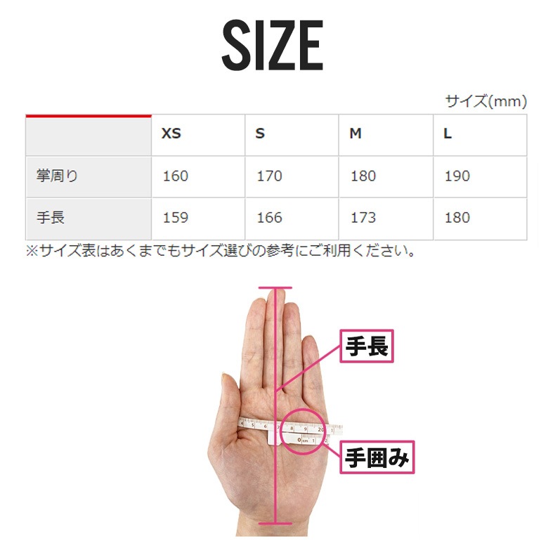 | 素材 | 甲側:マックステックス[ポリエステル素材] 掌側:合成皮革 中綿/防水フィルム入り |