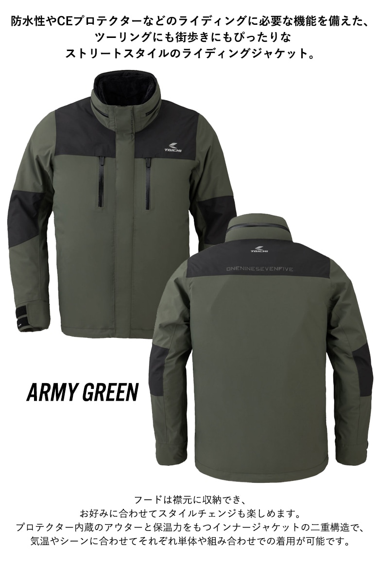 プロテクター内蔵のアウターと保温力をもつインナージャケットの二重構造で、気温やシーンに合わせてそれぞれ単体や組み合わせでの着用が可能です。