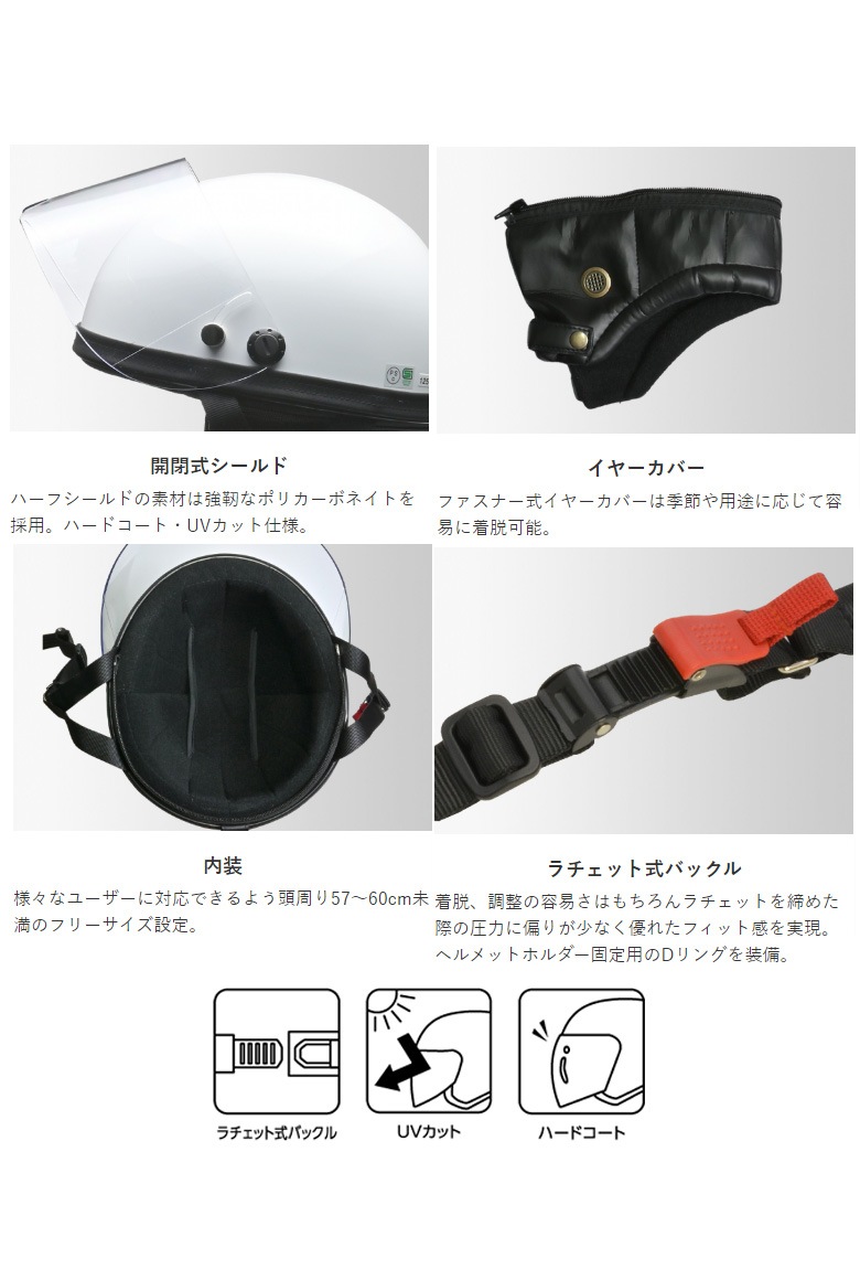 | 仕様 | 標準シールド:クリア 規格:125cc以下用 重量:約850g 付属品:サイズ調整スポンジ