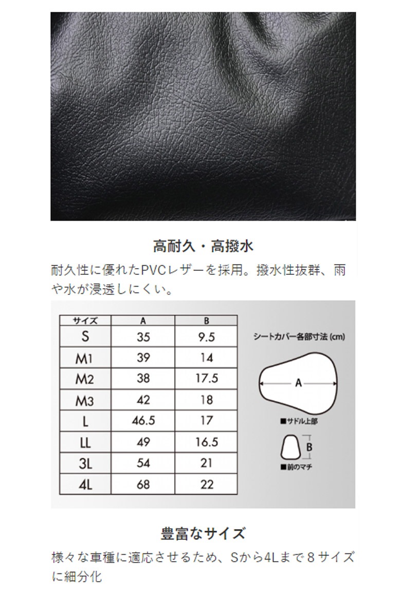 | 仕様 | ・高耐久・高撥水 耐久性に優れたPVCレザーを採用。撥水性抜群、雨や水が浸透しにくい。 ・豊富なサイズ 様々な車種に適応させるため、Sから4Lまで8サイズに細分化。 |