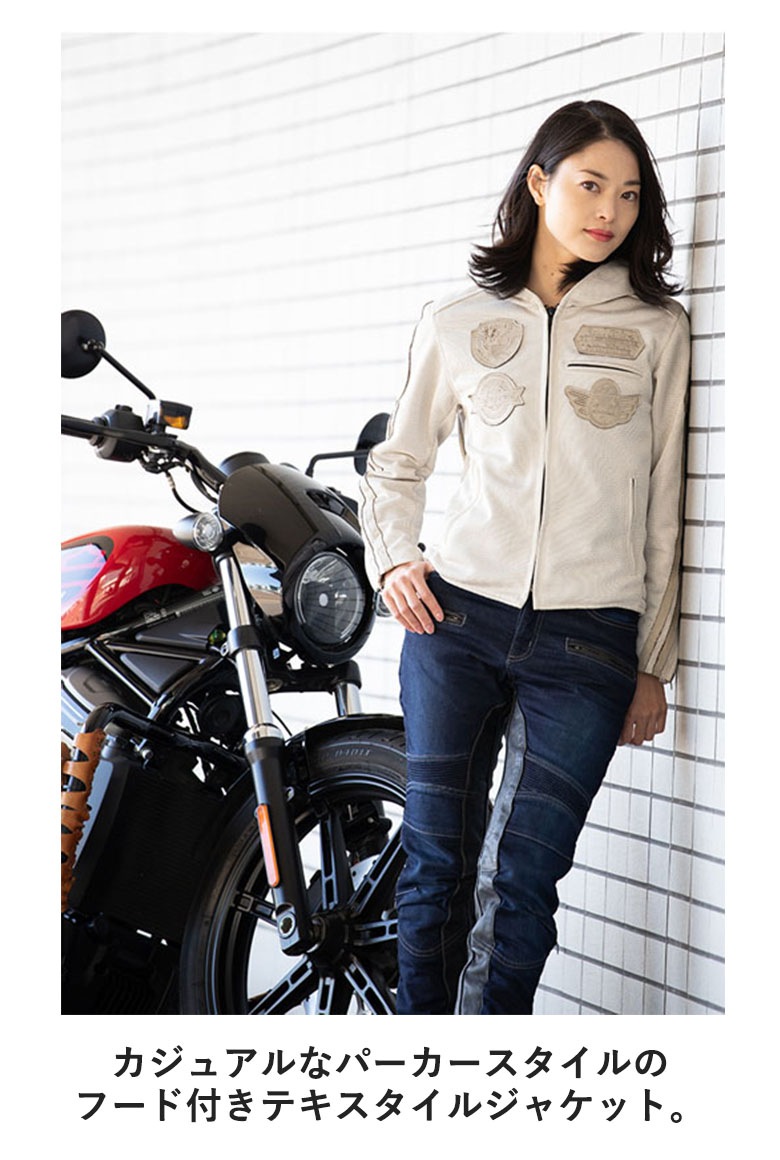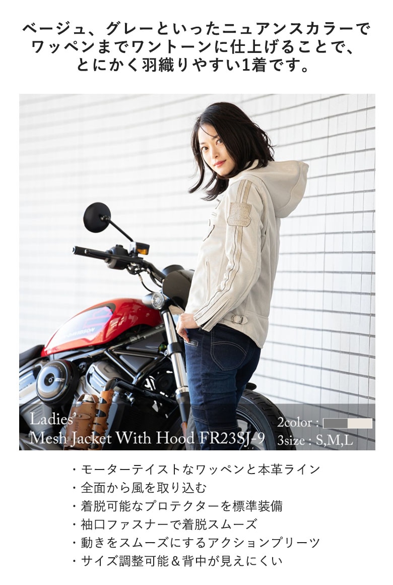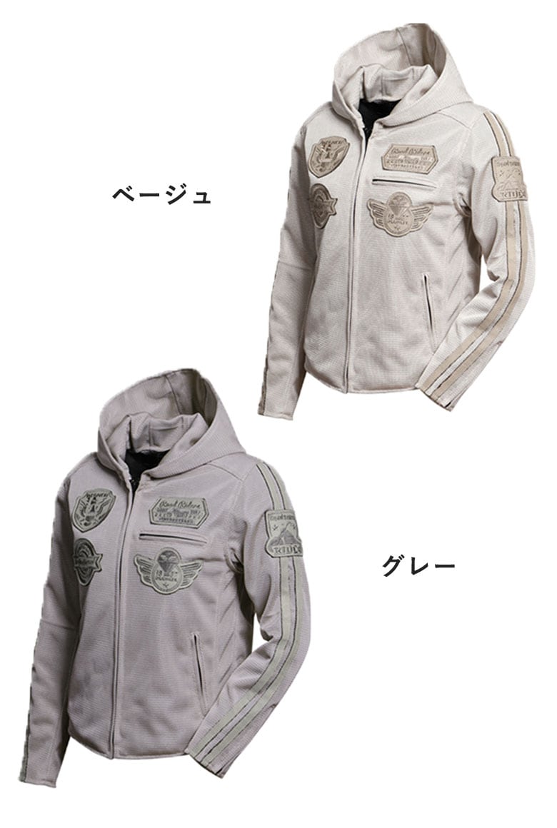 | 仕様 | ■モーターテイストなワッペンと本革ライン ■全面から風を取り込む ■着脱可能なプロテクターを標準装備 ■パーカースタイルのメッシュジャケット ■袖口ファスナーで着脱スムーズ ■動きをスムーズにするアクションプリーツ ■サイズ調整可能&背中が見えにくい |