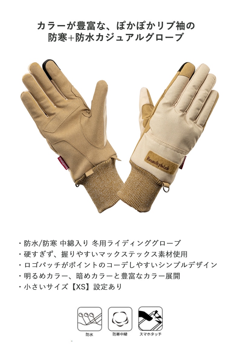 | 仕様 | ーRIDDING POINTー ・防寒中綿入りで暖かい ・ライディングポジション用立体構造 ・硬すぎず、握りやすいマックステックス素材使用 ・袖口リフ゛付きて゛、風の侵入を防止 ・防水シートインサート構造で、急な雨にも安心 ・人差し指先:スマホタッチ機能搭載 |