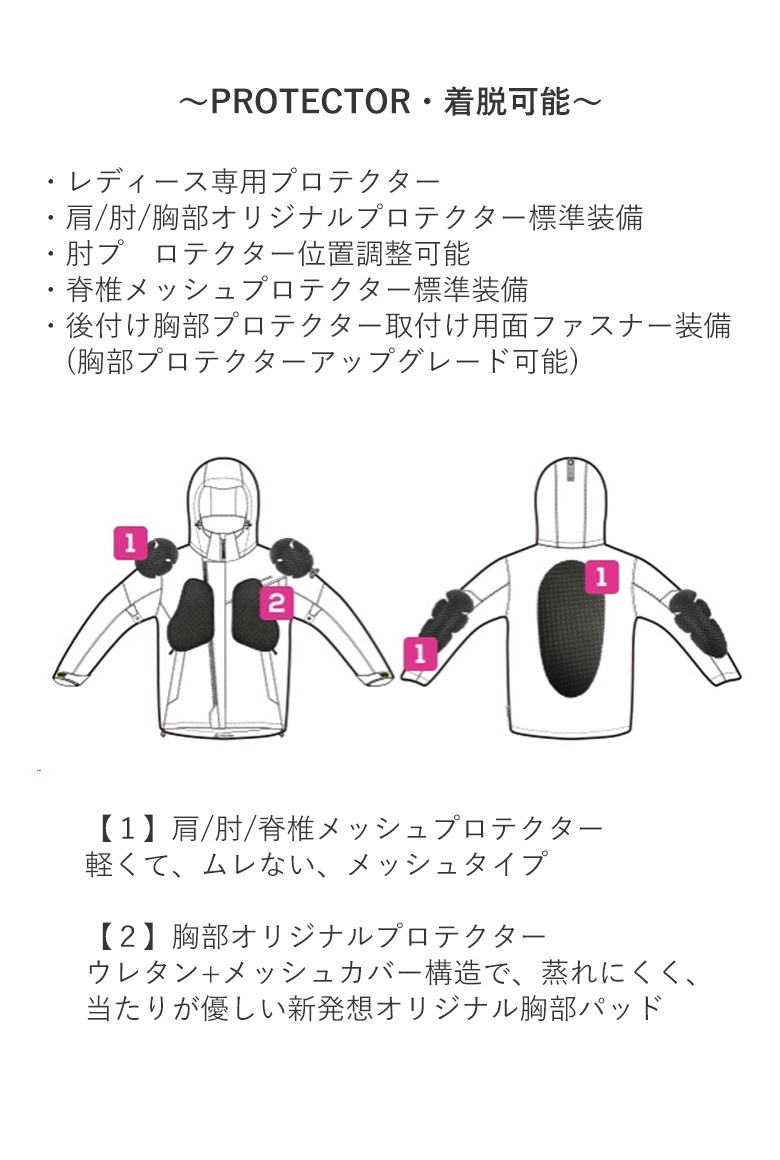 | 仕様 | ーRIDDING POINTー ・レディース専用の肩/肘/脊椎/胸部プロテクター付き ・ストレッチ機能生地で動きやすい ・裏ボア仕様で包み込むような暖かさ ・袖の内側は動きやすくするためボアなし袖 ・長時間ライディングのストレス減少 ・ライディングポジション用立体構造 ・フード取り外し可能(ファスナー脱着) ・フート゛ハ゛タツキ防止機能搭載 ・両袖後の縫製には反射リフレキ糸のステッチ使用で視認性UP 〜PROTECTOR・着脱可能〜 ・レディース専用プロテクター装備 ・肩/肘/胸部オリジナルプロテクター標準装備 ・肘フ゜ロテクター位置調整可能 ・脊椎メッシュプロテクター標準装備 ・後付け胸部プロテクター取付け用面ファスナー装備 (胸部プロテクターアップグレード可能) |
