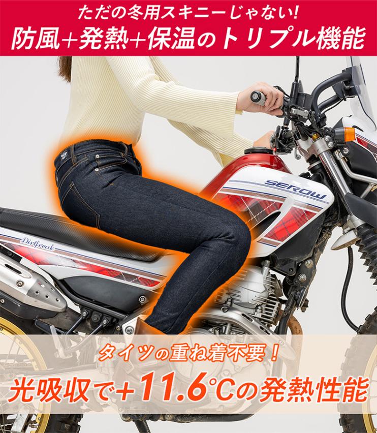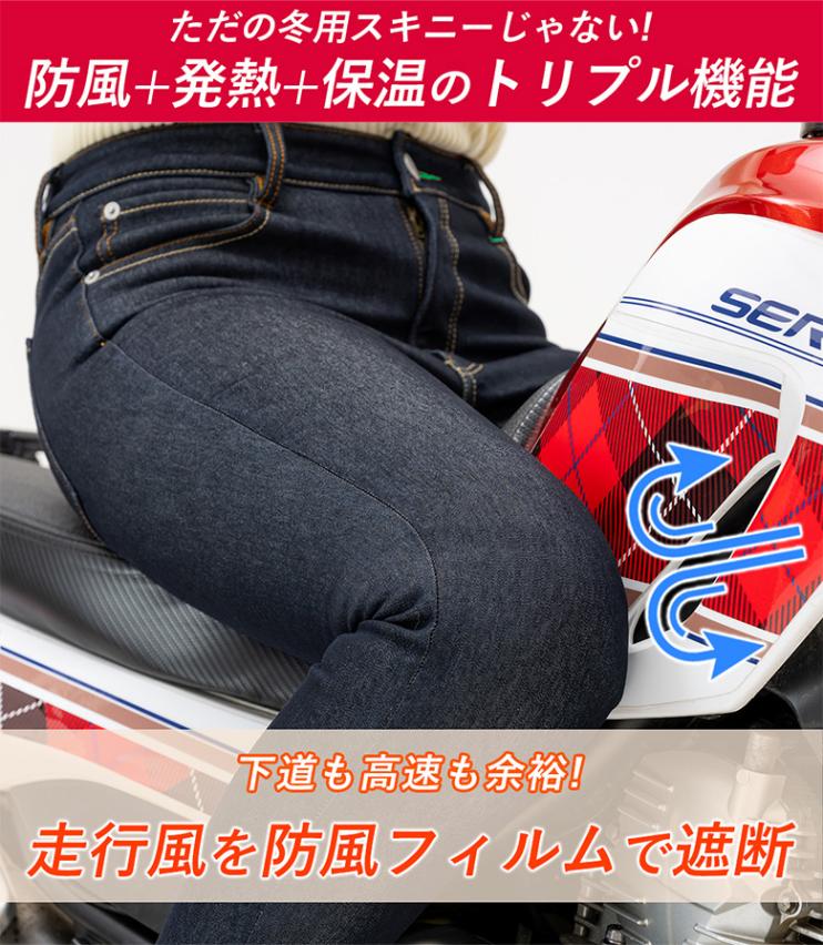 【美脚脚長効果】 バイクに乗った時も降りた時も常に美しいシルエット。 【サイズ】 体型に合わせて選べるウエスト6サイズ。 【ストレッチデニム】 伸長率15%のストレッチデニム。 【オートバイ専用設計】 脚を包み込む立体カッティングと生地のストレッチ性で快適になる設計。 等の女性ライダーの声を形にしました。 6通りのサイズからピッタリなスキニーをお選び下さい! |