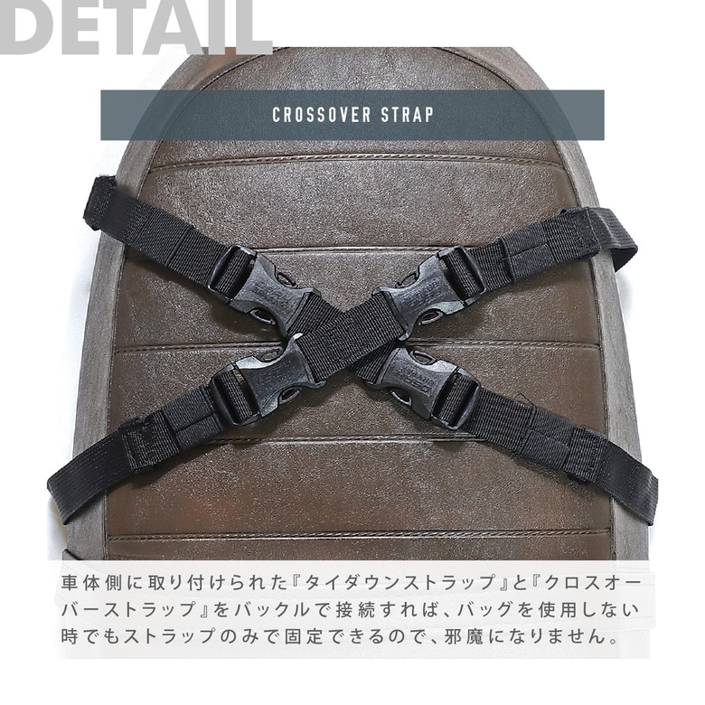 ・車体側に取り付けられた『タイダウンストラップ』と『クロスオーバーストラップ』をバックルで接続すれば、バッグを取り外した際や、バッグを使用しないときもストラップのみで固定できるので、邪魔になりません。