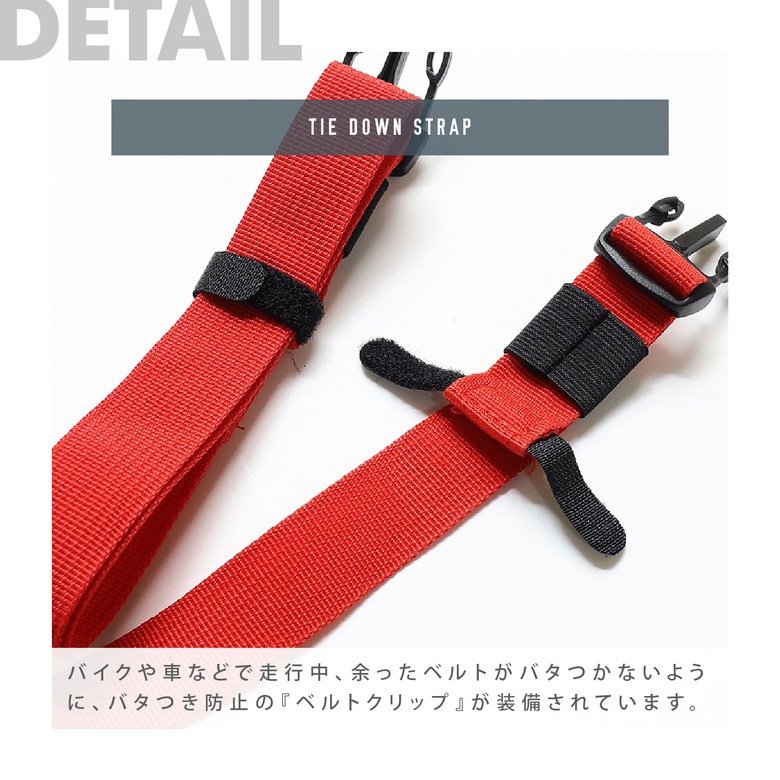 ・バイクや車などで走行中、余ったベルトがバタつかないように、バタつき防止の『ベルトクリップ』が装備されています。
