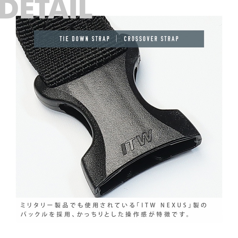 | 仕様 | ・バタつき防止ベルトクリップ付きタイダウンストラップ付属(4本) ・クロスオーバーストラップ(2本) ・高強度なITW NEXUS製バックルを採用 |