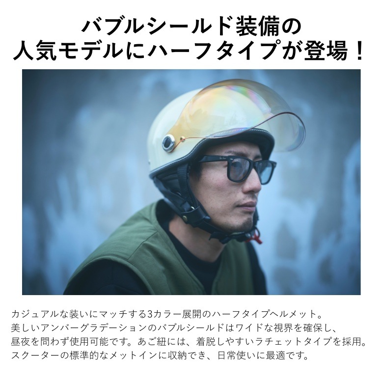 カジュアルな装いにマッチする3カラー展開のハーフタイプヘルメット。
