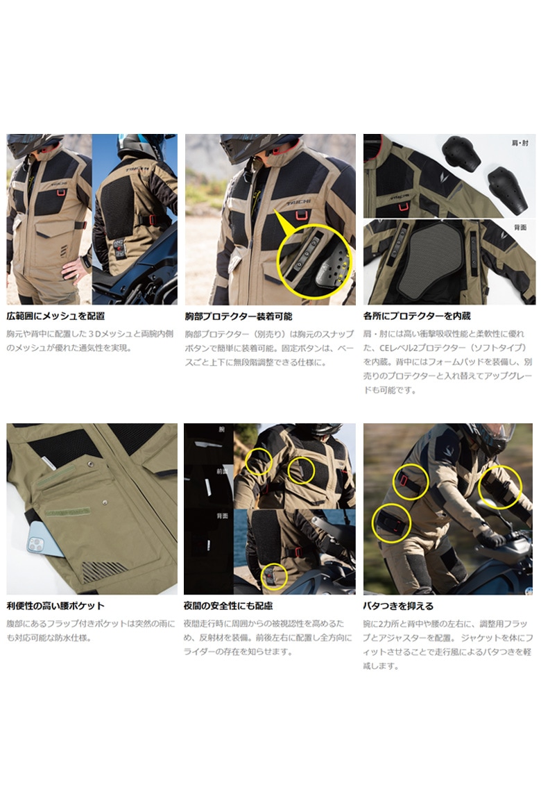 胸元や背中に配置した3Dメッシュと両腕内側のメッシュが優れた通気性を実現し、 真夏のライディングも快適にする、アドベンチャータイプのエアスルージャケット。 全方向からの視認性を高める、前後左右の反射材と肩・肘のCEレベル2プロテクターにより高い安全性も備えています。