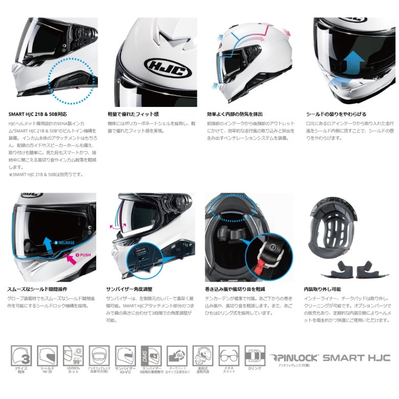HJCヘルメット専用設計インカム“SMART HJC 21B & 50B”(別売り)のビルトイン機構を装備し、インカム装着時もヘルメットのデザインや空力性能を妨げることなくツーリングを楽しめます。