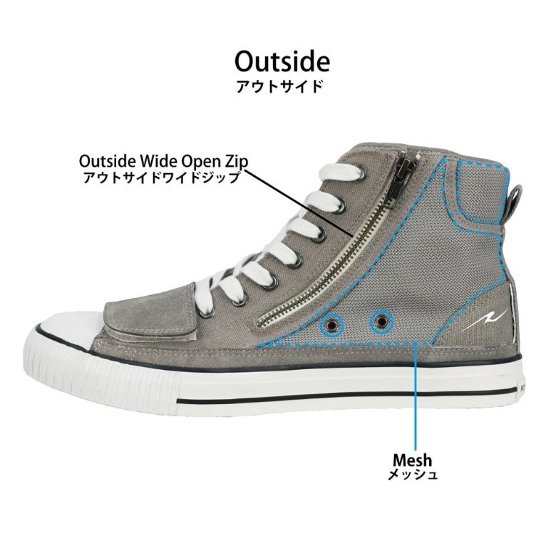 斜めに大きく開くファスナーは靴ひもをほどく必要がなく脱ぎ履きのしやすさが抜群です。しかも外側ファスナー仕様なので車体を傷つける心配がありません。踵にはリフレクターを装備し、視認性を確保。また、くるぶし内側に厚めのクッションを入れ車体をホールドしやすくしています。左足に装備した大きめのシフトガードは、幅5.5センチとシフト場所の個人差にも余裕で対応。また表面に凹凸のある立体カップインソールを採用し、通気性とクッション性を高め快適さが向上。